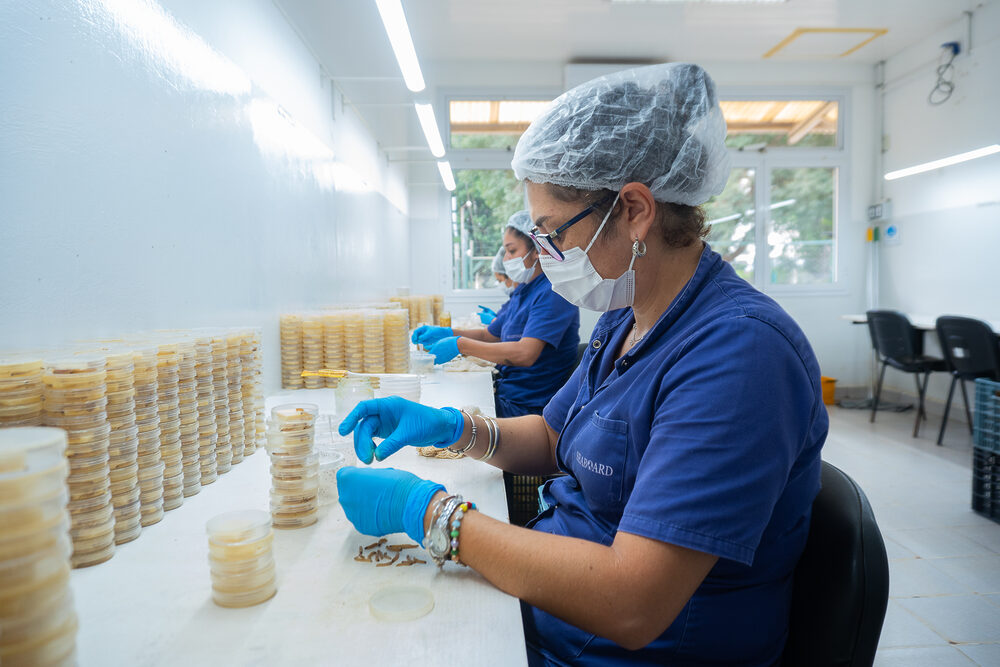 En este laboratorio cultivamos una pequeña avispa conocida científicamente como Cotesia Flavipes, que actúa como control biológico natural del gusano barrenador que afecta la caña. De esta forma eliminamos el uso de pesticidas, generamos nuevas fuentes de trabajo -especialmente mujeres que cuentan con mayores habilidades de motricidad fina-, conservamos el ambiente y reducimos los índices de infestación en nuestras plantaciones, garantizando la calidad del producto.